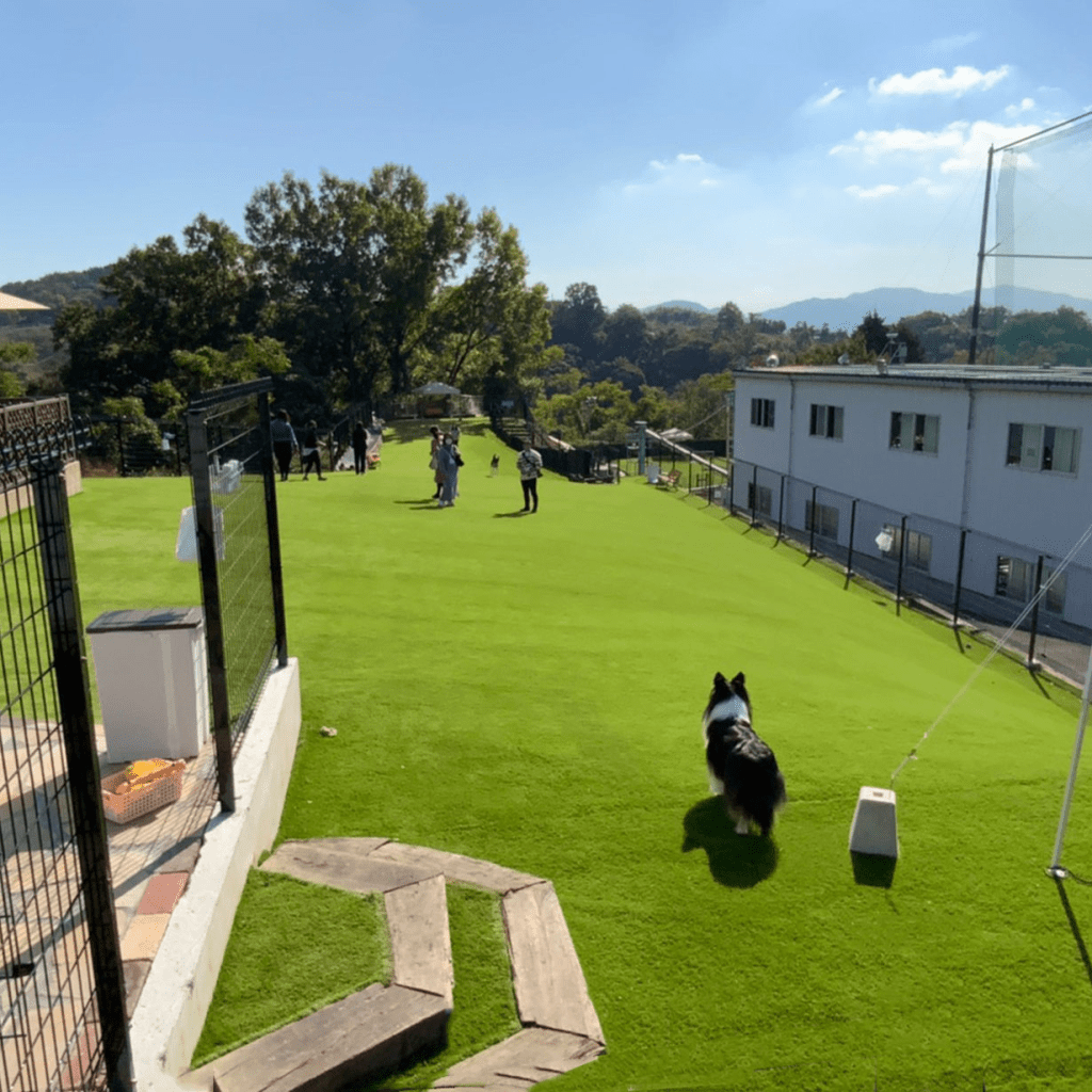 2022年オープン、関西でも有数の大型ドッグラン。全犬種1000㎡、小型犬300㎡、直線70mの広々空間はやわらか人工芝で足にもやさしい。ドッグトレーナー/ペットシッター常駐で安心。夏季はドッグプールで水遊びも満喫!